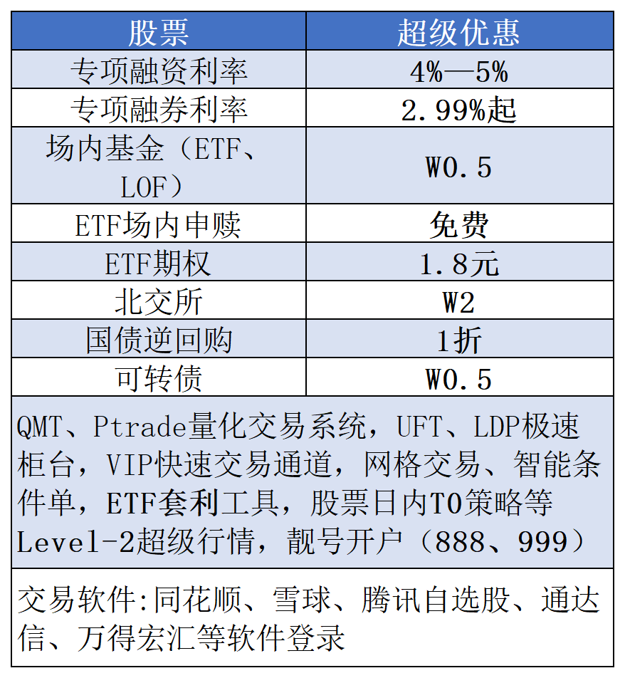 上市大券商提供超低股票交易佣金,场内基金和可转债交易费率可低至十万分之五。国债逆回购享有一折优惠,专项融资融券利率4%—5%(量大可进一步协商),期权交易每张仅需1.8元全包。